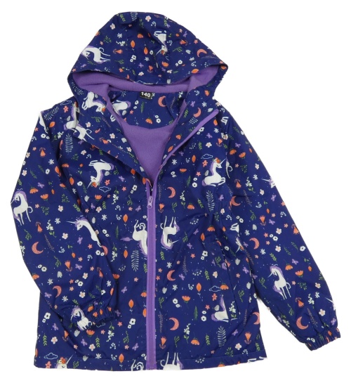 Tmavomodrá květovaná šusťáková jarní parka s jednorožci a kapucí