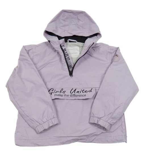Lila šusťáková jarní bunda s nápisem a kapucí Pag