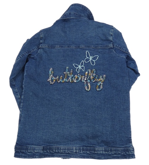 Tmavomodrá riflová bunda s nápisem