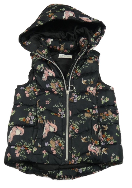 Černá květovaná šusťáková zateplená vesta s jednorožci a kapucí H&M