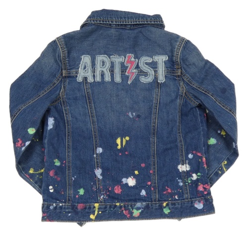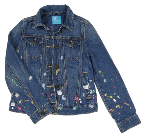 Modrá riflová bunda se skvrnami a nápisem GAP