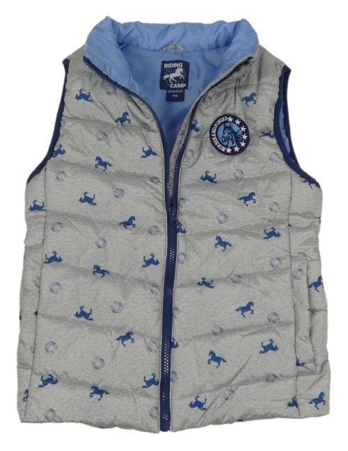 Šedo-modrá šusťáková zateplená vesta s koníky a nášivkou