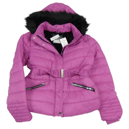 Nové - tmavorůžová prošívaná šusťáková zimní bunda s kapucí s kožešinou a páskem George