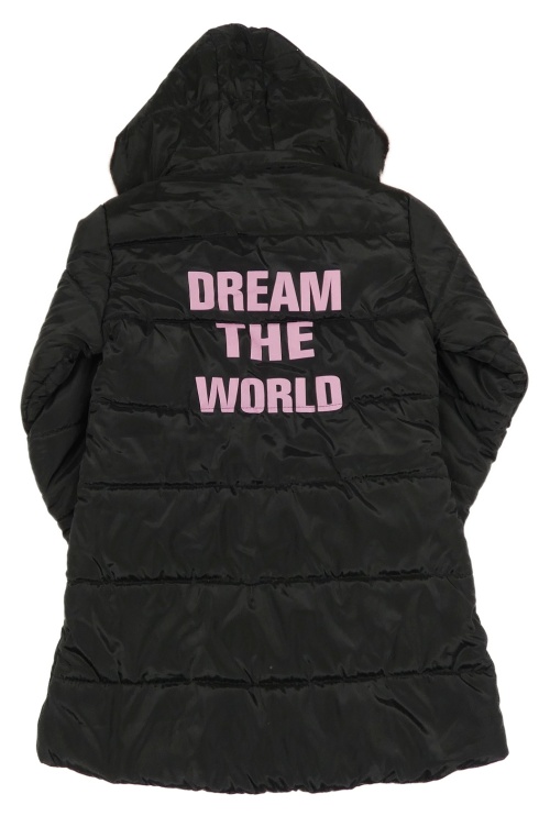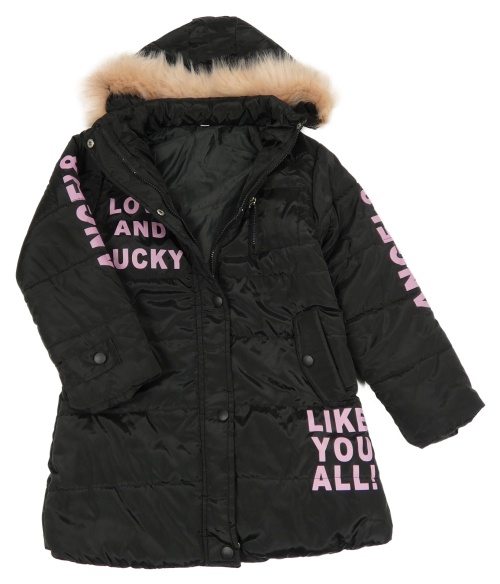 Černý prošívaný šusťákový zimní kabát s nápisy a odepínací kapucí s kožešinou