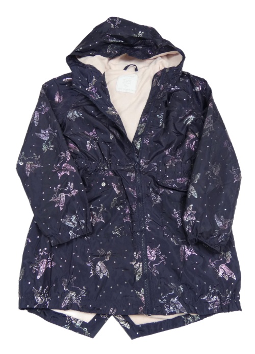Tmavofialová šusťáková jarní parka s jednorožci a kapucí Matalan