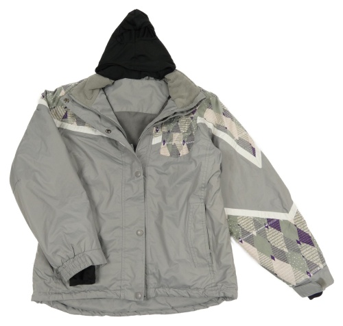 Šedá šusťáková zimní lyžařská bunda s potiskem a kuklou