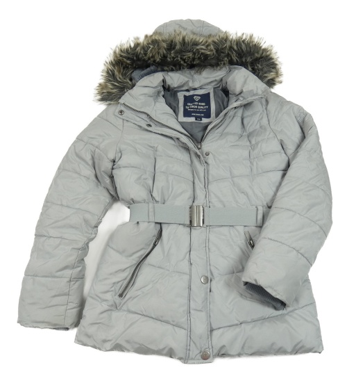 Šedá šusťáková zimní bunda s páskem a kapucí s kožešinou