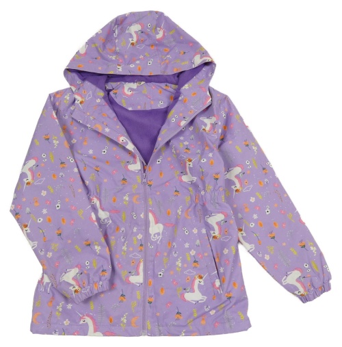Fialová šusťáková jarní bunda s jednorožci a kapucí