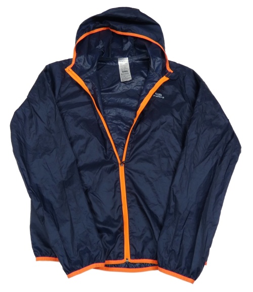 Tmavomodrá šusťáková nepromokavá funkční bunda s logem a kapucí Kalenji