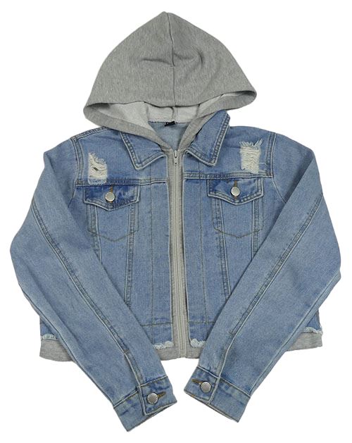 Světlemodro-šedá riflovo/tepláková crop bunda s prošoupáním a kapucí SHEIN