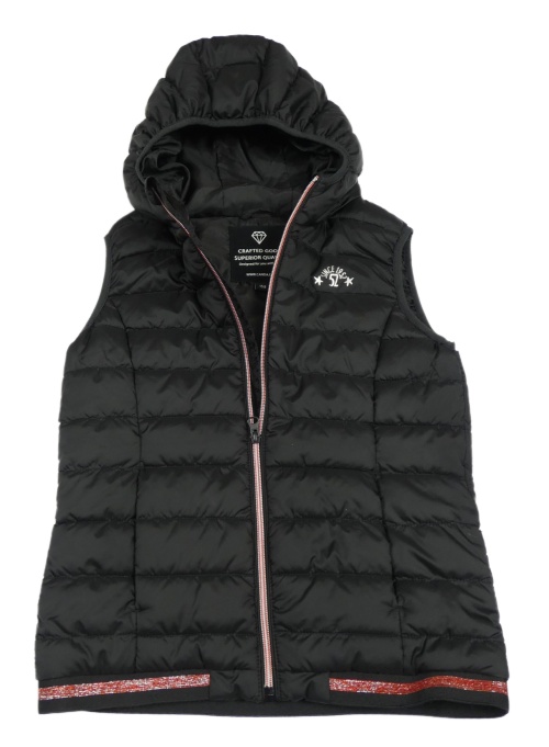 Černá šusťáková zateplená vesta s nápisem a kapucí