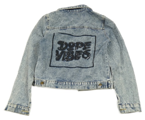 Modrá plísňová riflová crop bunda s nápisy z flitrů