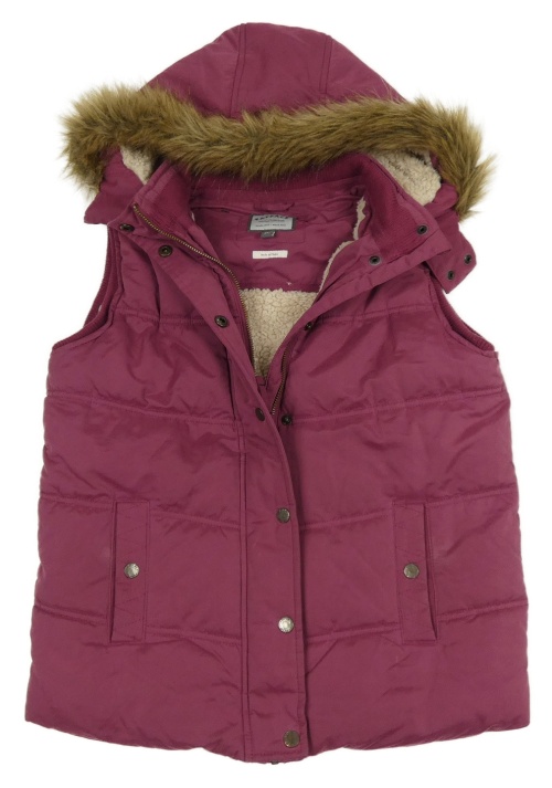Fialová šusťáková zateplená vesta s kapucí s kožešinou Fatface