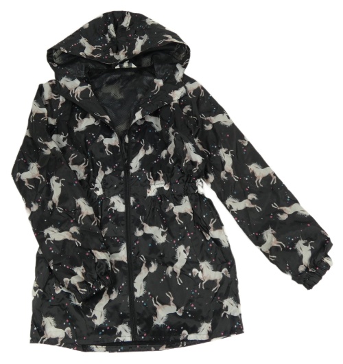 Černá šusťáková jarní parka s jednorožci a kapucí E-Vie