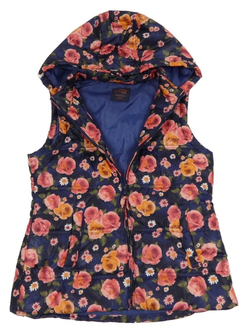 Tmavomodrá vzorovaná prošívaná šusťáková zateplená vesta s růžemi a kapucí LC WaIKIKI