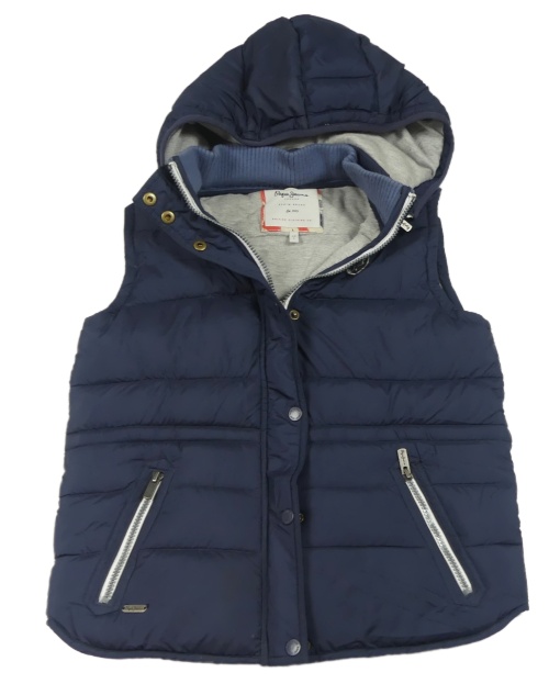 Tmavomodrá prošívaná šusťáková zateplená vesta s nášivkou a odepínací kapucí Pepe Jeans