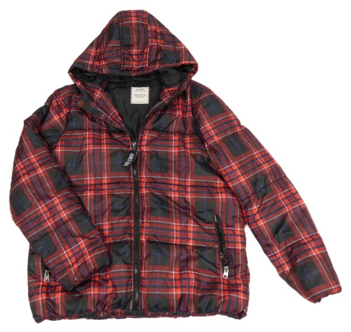 Černo-červená kostkovaná šusťáková zimní bunda s kapucí vel.176