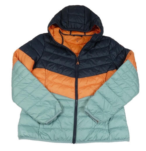 Tmavomodro-oranžovo-světlezelená šusťáková prošívaná zimní bunda s kapucí Denim