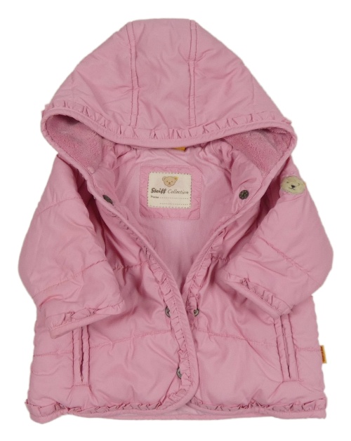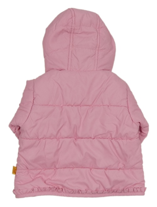 Růžová šusťáková zimní bunda s volánky a kapucí