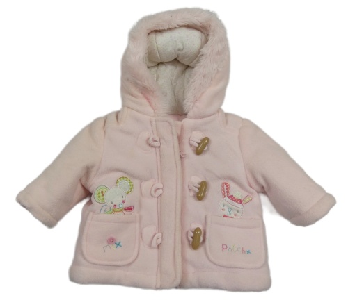 Světlerůžový fleecový zateplený kabátek s myškou a zajíčkem a kapucí s kožešinou