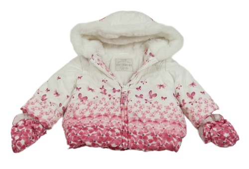 Bílo-růžová šusťáková zimní bunda s motýly a kapucí + rukavice George