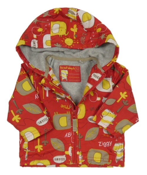 Červená šusťáková jarní bunda se zvířátky a s kapucí