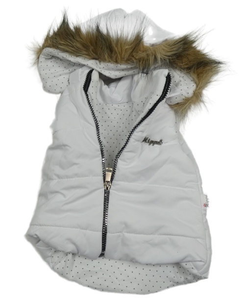 Bílá šusťáková zateplená vesta s kapucí s kožešinou
