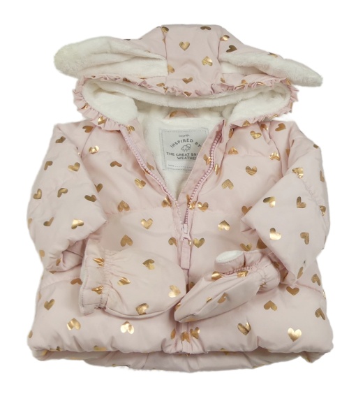 Světlerůžová prošívaná šusťáková zimní bunda se zlatými srdíčky a kapucí s oušky + rukavice George
