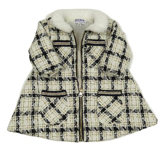 Bílo-černo-zlaté kostkovaný podšitý kabát s kožešinou