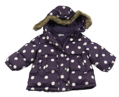 Fialovo-bílá puntíkatá šusťáková zimní bunda s kapucí s kožešinou Mamas&Papas