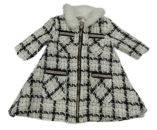 Smetanovo-černo-zlatý kostkovaný vzorovaný podšitý kabát s kamínky a řetízkem a kožešinovým límečkem BLUE BERi