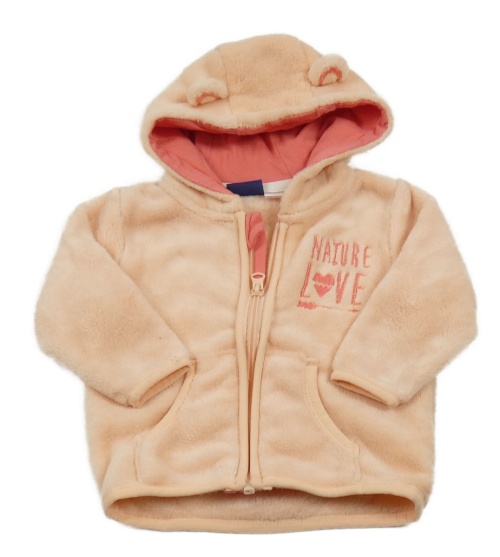 Meruňková plyšová bunda s nápisy a šípem a kapucí s oušky lupilu