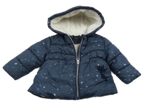 Tmavomodrá prošívaná šusťáková zimní bunda s hvězdičkami a mašlí a kapucí name it.