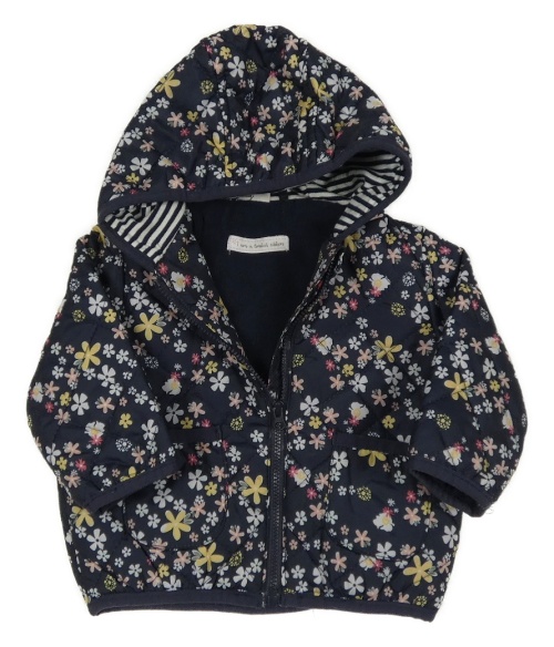 Tmavomodro-květovaná šusťáková prošívaná zateplená bunda s kapucí