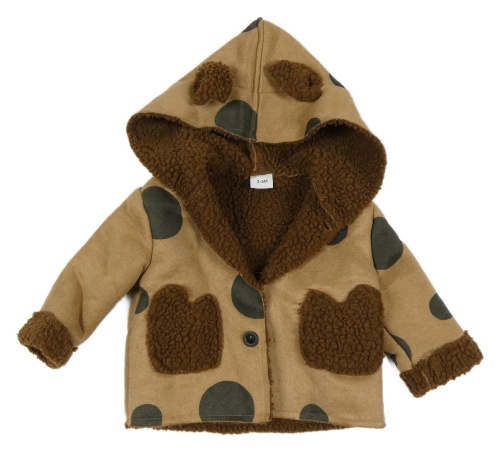 Hnědý puntíkatý semišový zateplený kabátek s kapucí s oušky