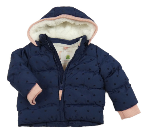 Tmavomodro-světlerůžová šusťáková zimní bunda s puntíky a kapucí Topolino