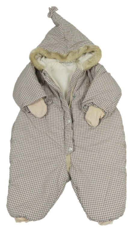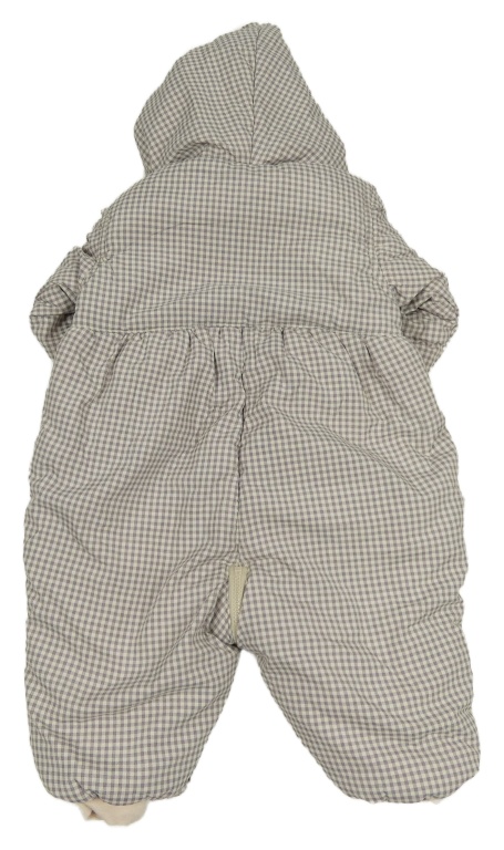 Levandulovo-smetanová kostkovaná šusťáková zimní kombinéza s mašlemi a kapucí