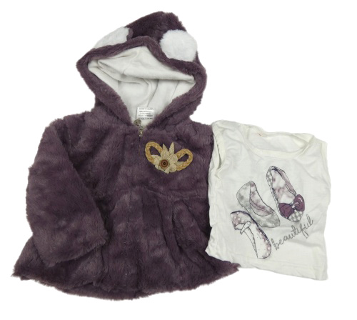 2set - Fialová kožešinová bunda s mašlí a kapucí + bílé tričko s balerínami