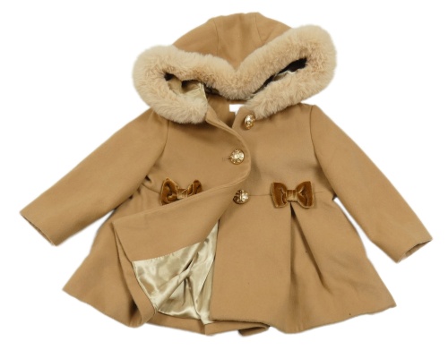 Světlehnědý flaušový podšitý kabát s mašlemi a kapucí s kožešinou Monsoon