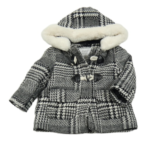 Bílo-černý vzorovaný pletený podšitý kabát s kapucí s kožešinou F&F