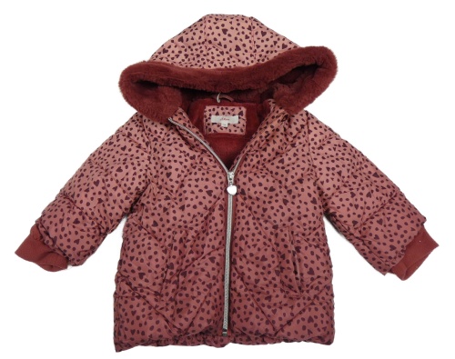 • Starorůžovo-vínová puntíkatá prošívaná šusťáková zimní bunda se srdíčky a kapucí s kožešinou S. Oliver
