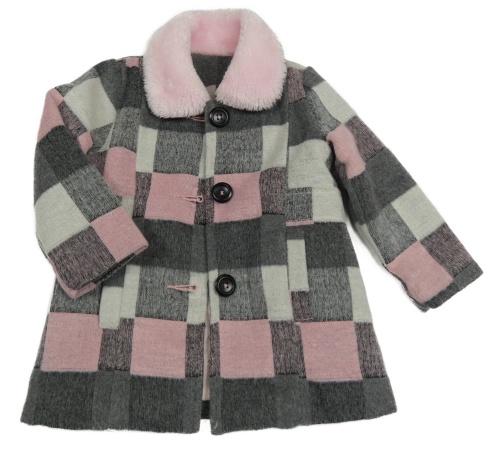 Bílo-šedo-růžový kostkovaný podšitý vlněný kabátek s kožešinovým límcem