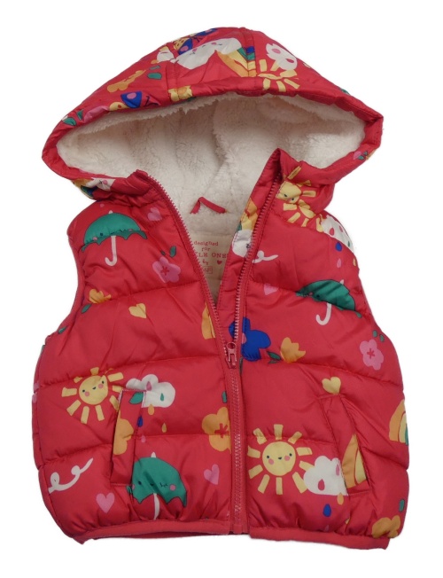 Tmavorůžová šusťáková zateplená vesta se sluníčky a kapucí