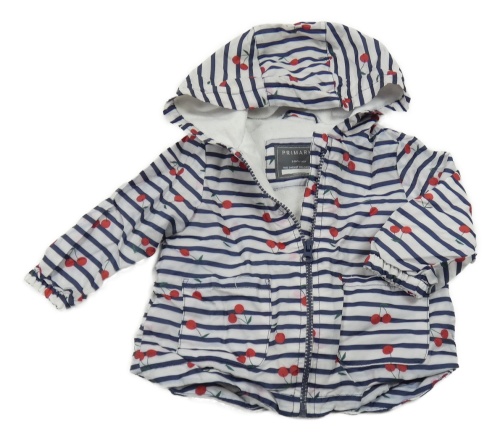 Bílo-tmavomodrá pruhovaná šusťáková jarní bunda s třešničkami a kapucí PRIMARK