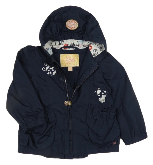Tmavomodrá šusťáková jarní bunda s výšivkou a kapucí