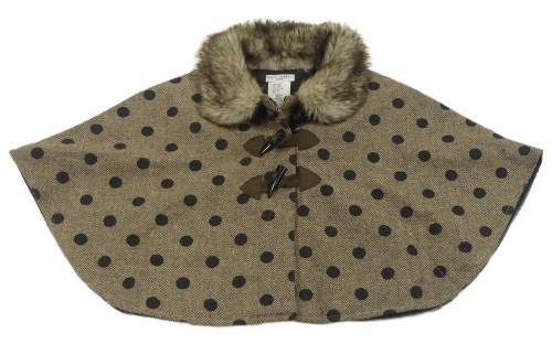 Hnědo-béžovo-černé vzorované puntíkaté kabátové podšité pončo s kožešinou