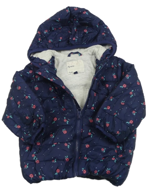 Tmavomodrá prošívaná šusťáková zateplená bunda s kytičkami a kapucí C&A
