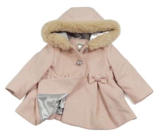 Růžový flaušový podšitý kabát s mašlemi a kapucí s kožešinou Monsoon