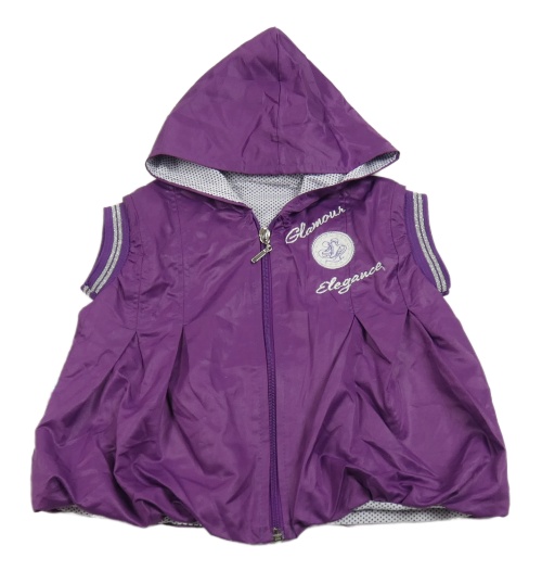 Fialová šusťáková jarní vesta s nápisem a kapucí