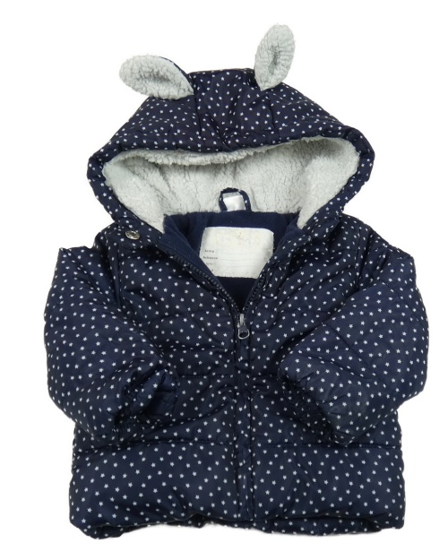 Tmavomodrá šusťáková zateplená bunda s hvězdami a kapucí